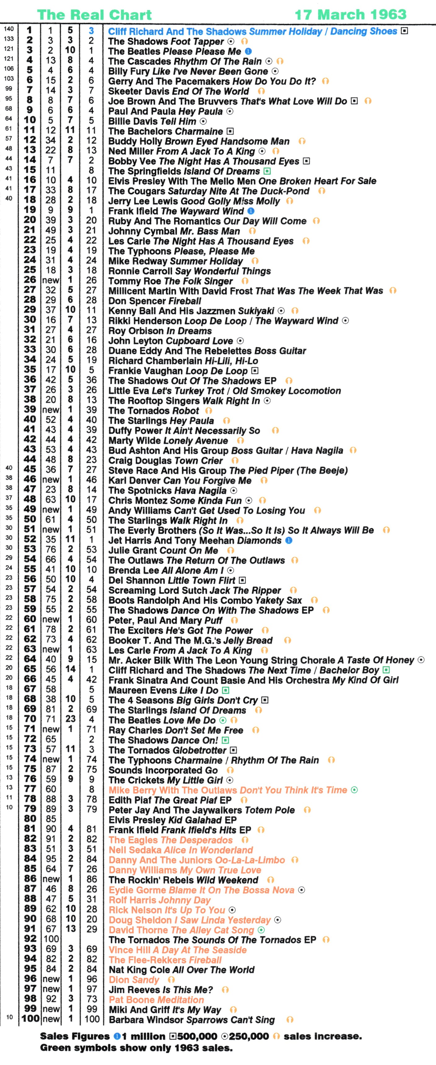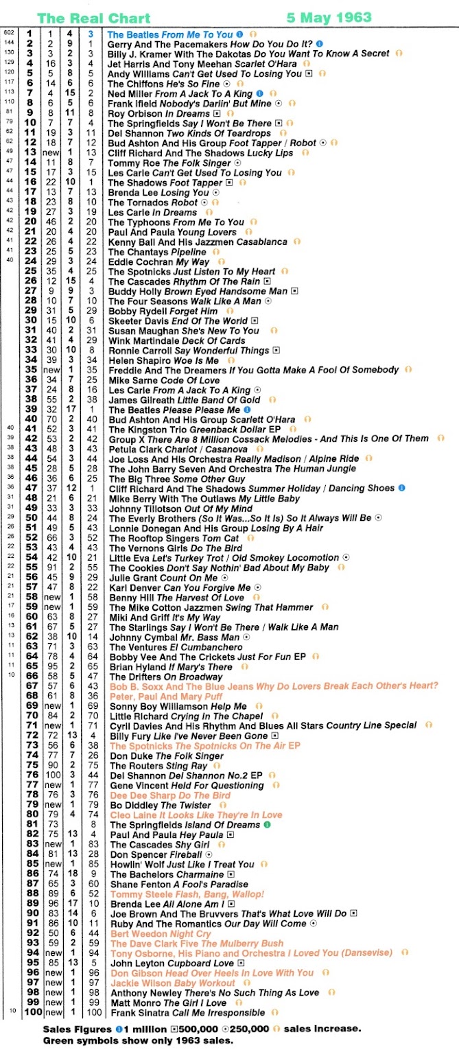 There now follows the 1963 Real Charts. As we are starting the year when the previous year's charts have not been completed, there will of course be gaps in the columns. I did complete the last chart of 1962 the 23 December 1962, but that is far from finished and will not be shown yet. But all the last week and new entry positions are accounted far. As always the sales symbols at first will show green symbols, just an indication of the 1963 sales. The first chart contains two week sales and therefore does not show any sales increase symbols. Some weeks have been filled in and where I have tracked back the weeks they are shown to. Any highest positions except number one or two records, for records from 1962, should be taken with caution. It's possible that they peaked higher in 1962, as yet unknown to me.