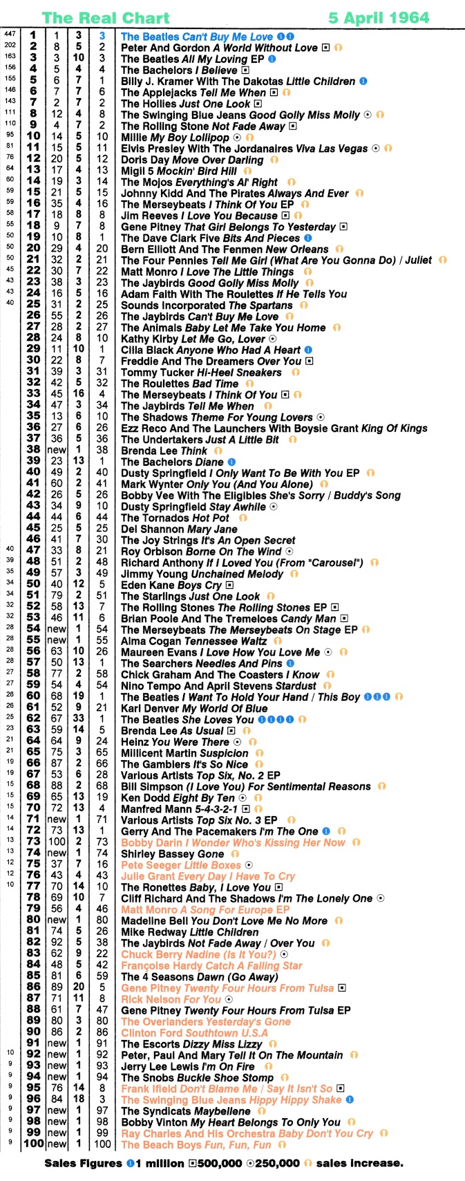There now follows the 1964 Real Charts. We start with a double week sales chart. This year starting with the very first chart we see the effect of the new TV show Top of The Pops, which started in January.