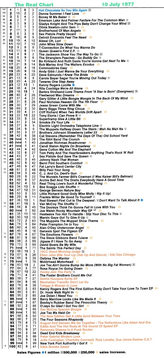 The first 1977 chart shown will be the full chart, including left over sales (blue) and the sales from 1977 columns will be seen. The following week you will only see the sales figures for the week, not the running totals. As the first chart combines two weeks sales, there are no arrow sales symbols. It does mention this at the bottom of the chart, but in my haste to print the chart off, I left out the word "two". Sorry about that. The top 100 best sellers is at the end.